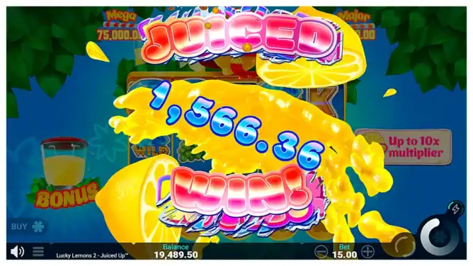 The Collect symbol gathers Lemon and Juiced Up values when landing on reel 5. Since values can reach 50x bet per symbol, combinations can escalate quickly. The Lemon Booster increases through 1UP symbols and resets after application in the base game. However, during Lucky Spins and Juiced Up Spins, it climbs up to 50x before resetting at feature end.